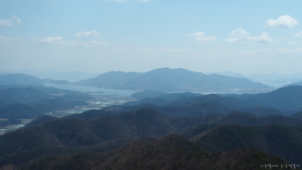 좌측 당항포 쪽으로 구절산 거류산 벽방산이 나란히 보입니다.