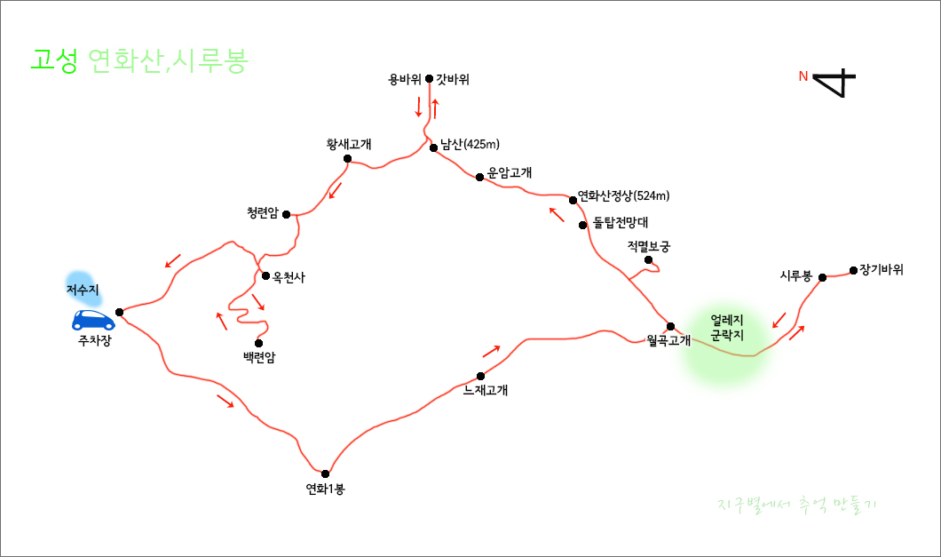 봉긋봉긋 연꽃같은 봉우리들을 오르내리다가 시루봉에서 탁 트인 조망을 즐기고 바로 앞 장기바위까지 다녀오면 새로운 연화산의 매력을 느낄 수 있을것 같습니다.