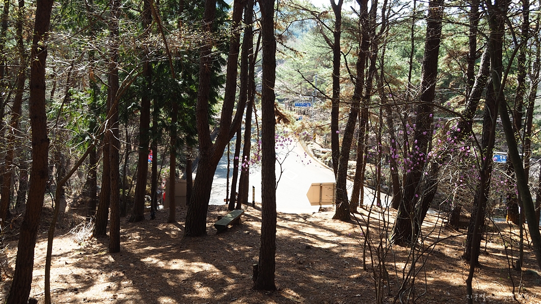 공룡주차장에서 조금 더 오르면 작은 저수지 옆에 화장실과 소형 주차장이 있습니다.