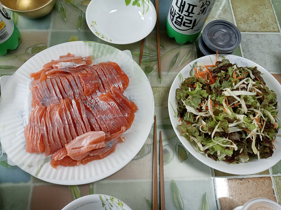 집으로 오는 길에 송어회 간판을 보고 2 인분을 구입했습니다.
