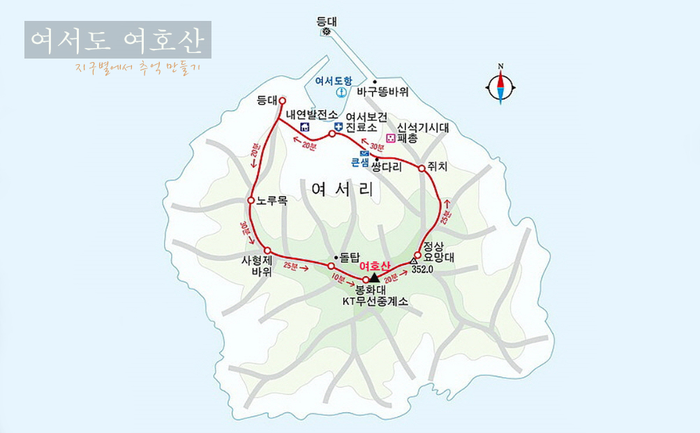 해발 352m로서 작은 섬 치고는 제법 높은 고도입니다만 산행거리는 5km 정도로 짧아서 빠른 두 시간 천천히 세 시간이면 된답니다.