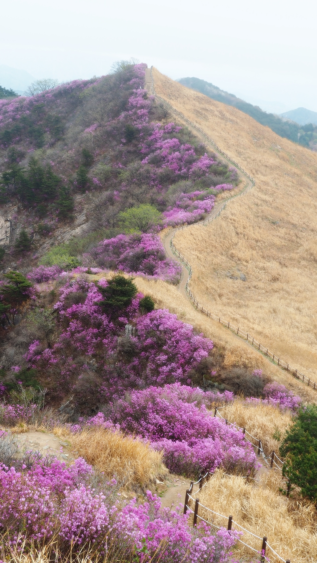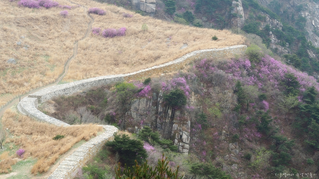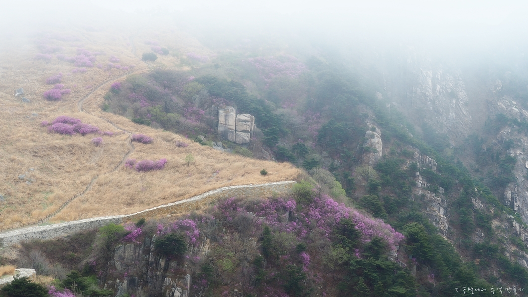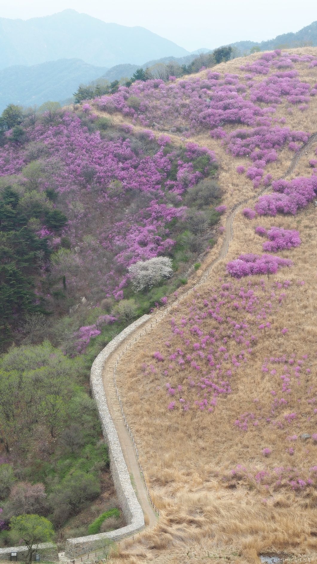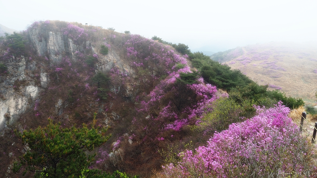 절벽으로 핀 진달래가 분홍 선을 만드는 환상적인 풍경.