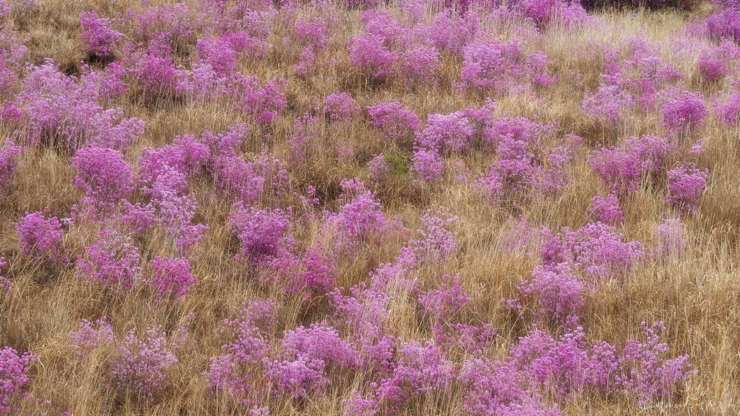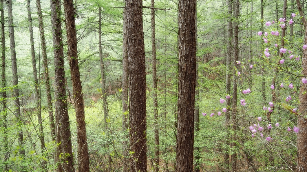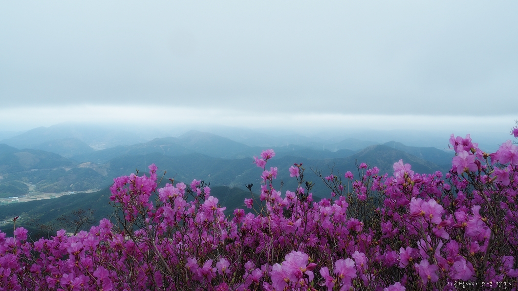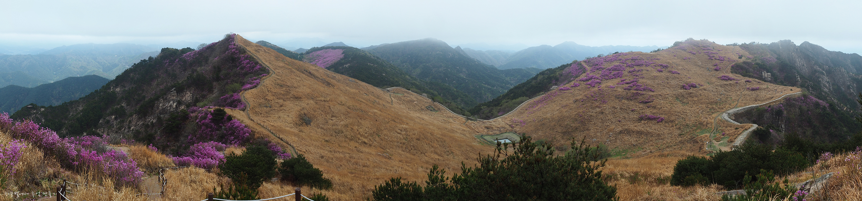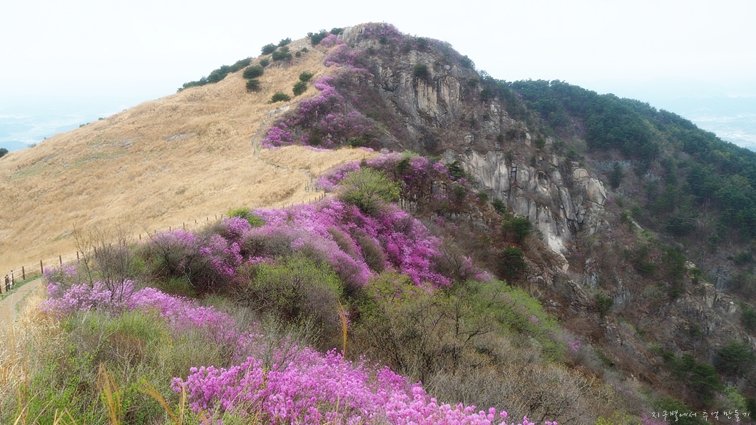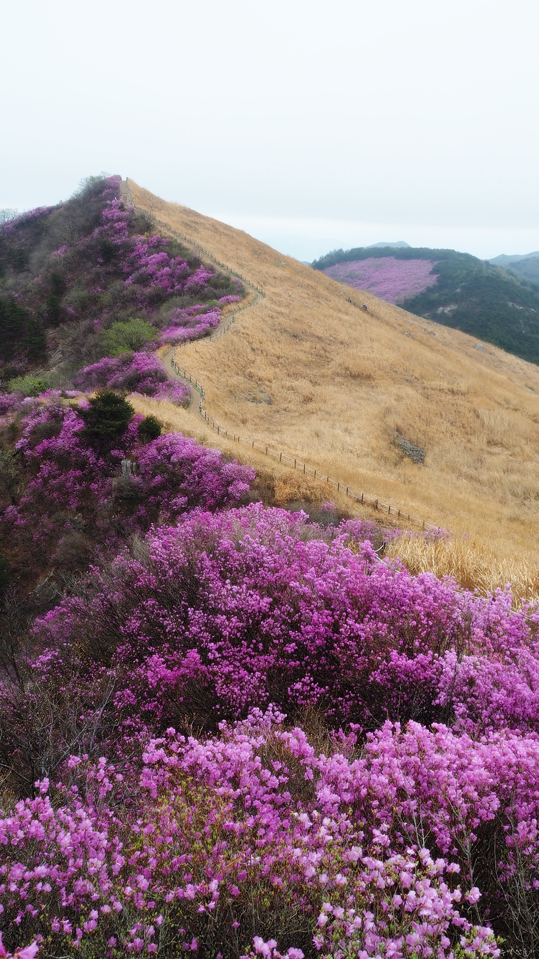 절벽으로 핀 진달래가 분홍 선을 만드는 환상적인 풍경.