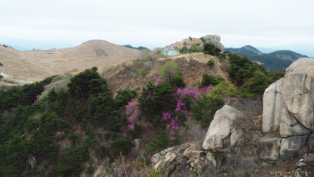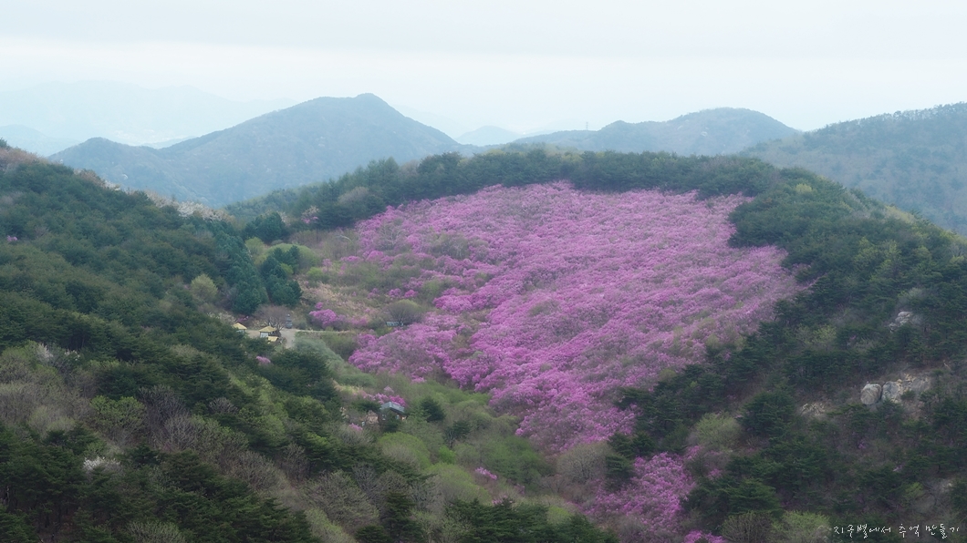 우측 밀리 허준 세트장 진달래 군락지와 오름편 배바위 쪽 진달래.