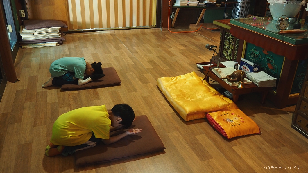 부처님께 절 하는 방법은 규범이 있지만 아이들한테 그 정도까지는 필요 없는듯 하여 그냥 맘대로 하게 놔 두었는데 지율이가 손바닥을 위로 올리는 걸 형한테 알려줘 그렇게 하고 있네요.