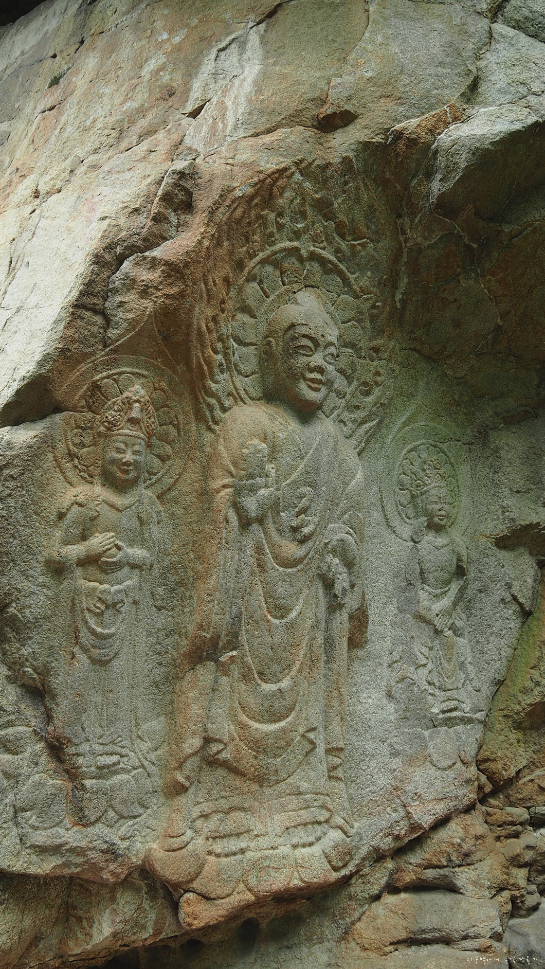 그냥 알아보기 쉽게 '바위에 새겨진 세 부처님' 이렇게 해 두면 얼마나 좋을까요.