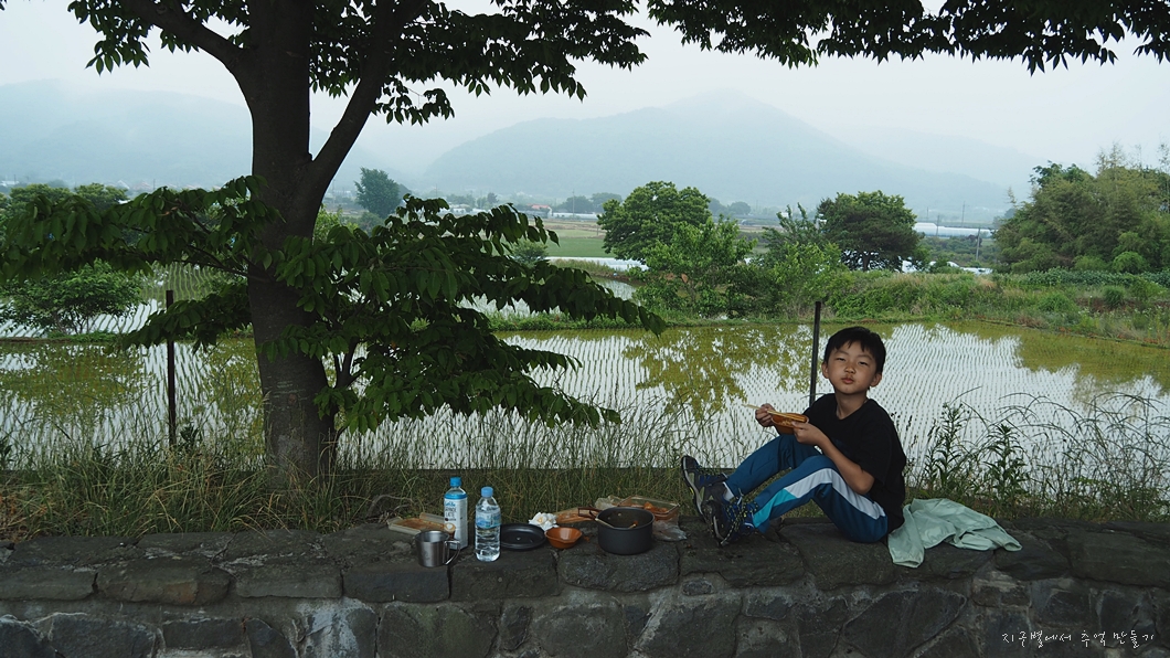 운산면 어느 도로변에 있는 작은 공원에서 라면 두 개 끓여서 아침 식사.