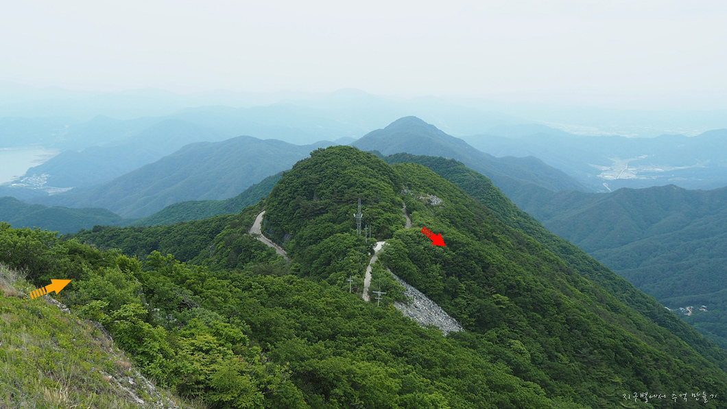 도로까지 내려서서는 도로를 따라 100m 정도 이동하면 빨강색 화살표 지점에서 오도재로 내려가는 등산로가 열려 있구요.