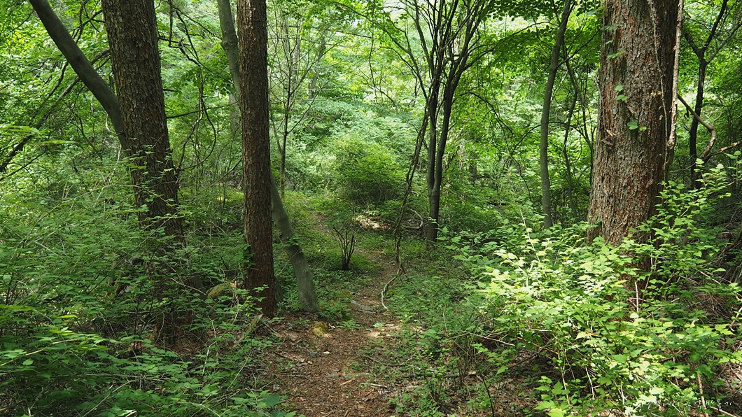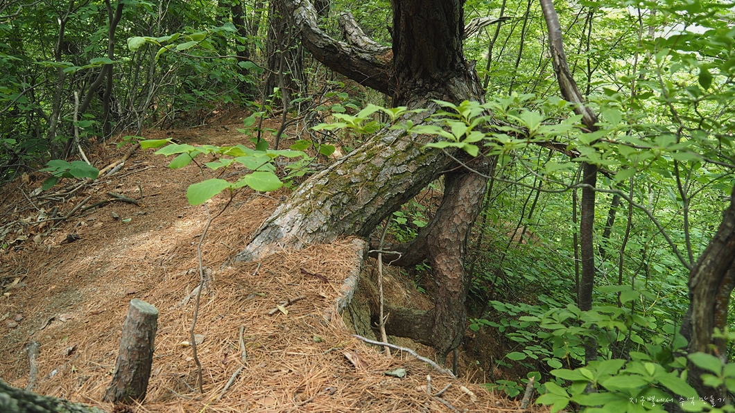 약간 내리막 지점에서 등산로는 우측으로 90˚ 꺽여집니다.