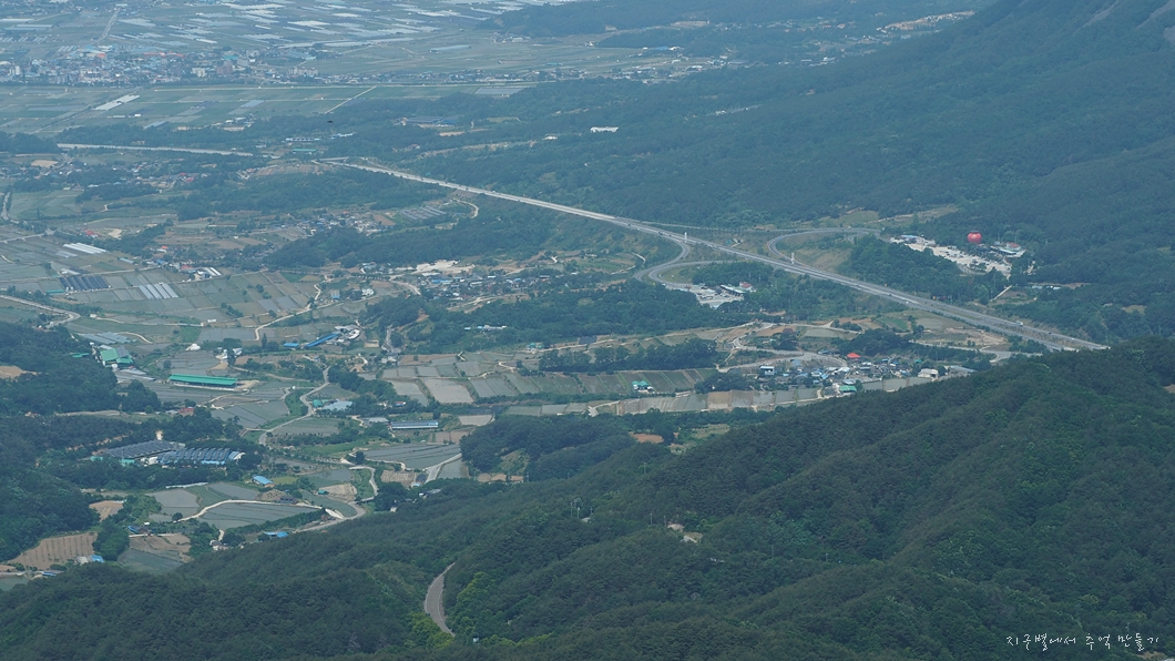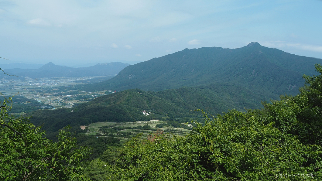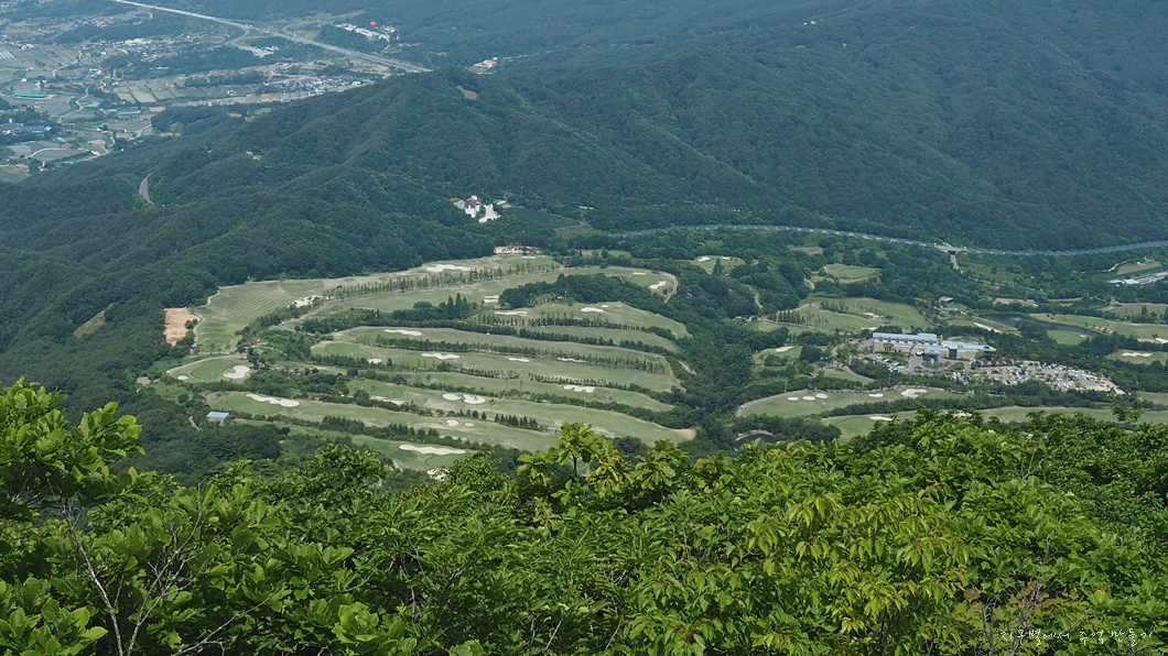 중간에 잠시 아래쪽이 트이는데 조금 전 자나 온 골프장과 뒷편 비계산이 조망 됩니다.