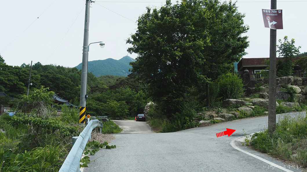 임도 같은 포장 산길을 따라 조금 더 오르면 수포대 입구이고 조금만 더 오르면 좌측으로 수포교라는 자그마한 다리를 건너고 바로 그 앞에 등산 안내도와 함께 널찍한 공터가 있답니다. (위 사진의 왼편)