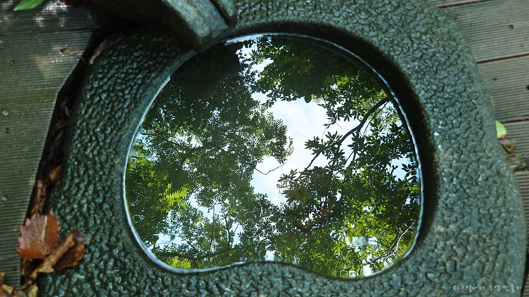 샘 앞 동물들의 식수간에는 푸른 자연이 가득 들어차 있네요.