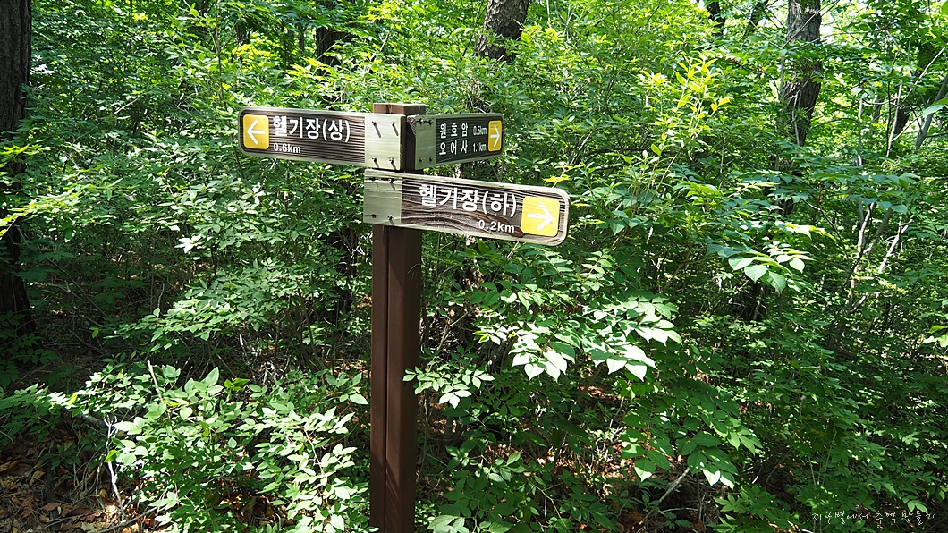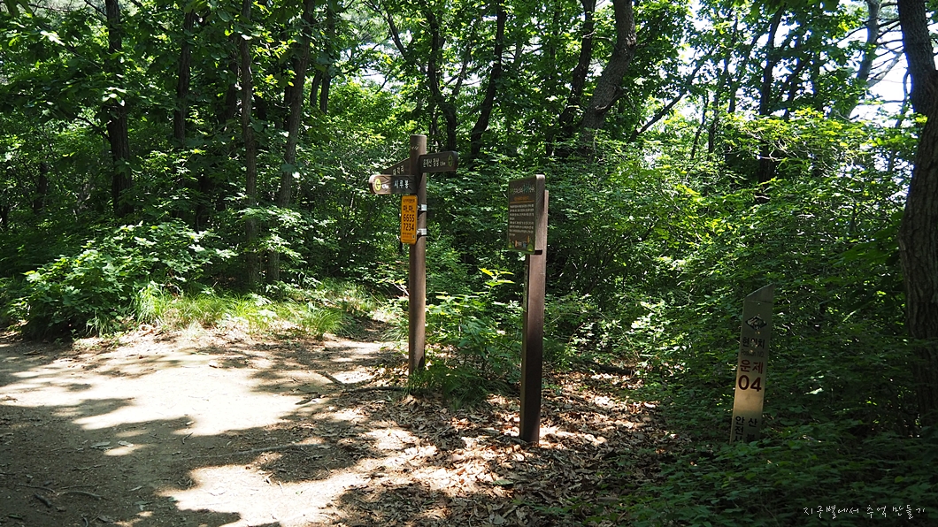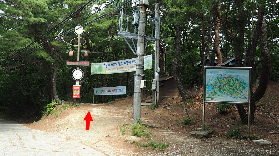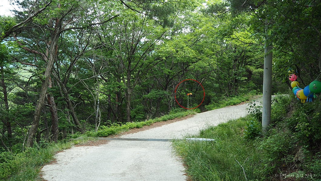 자장암에는 승용차로도 오를 수 있는데 올라오는 찻길을 따라 약 10분 정도 내려가면 위 사진의 빨강 원 안내판이 보이고 곧장 숲길을 따라 가면 됩니다.