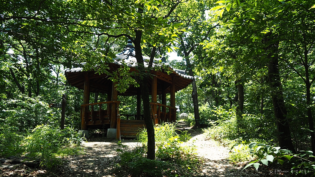 육각정이 있고 정상석은 정자 아래 있습니다.
