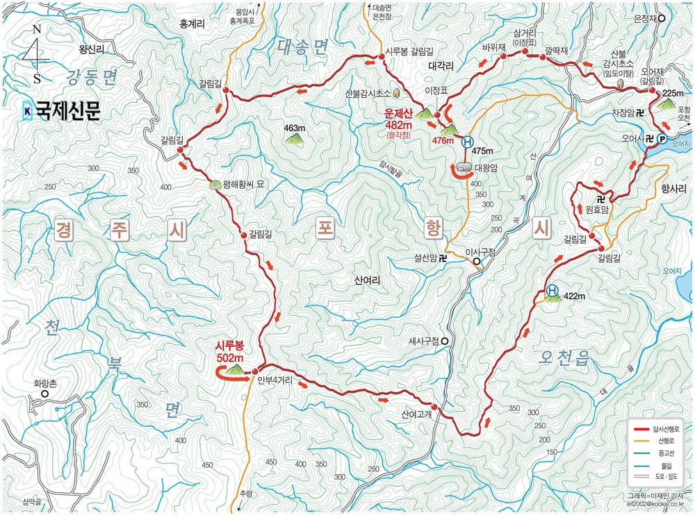 오어지 아래 주차장 - 오어지 - 자장암 - 깔딱재 - 바위재 - 운제산 - 대왕암 - (운제산 정상으로 되돌아 와서) - 시루봉 갈림길 - 시루봉 - 산여고개 - 원효암 - 오어사 - 주차장(원점회귀)