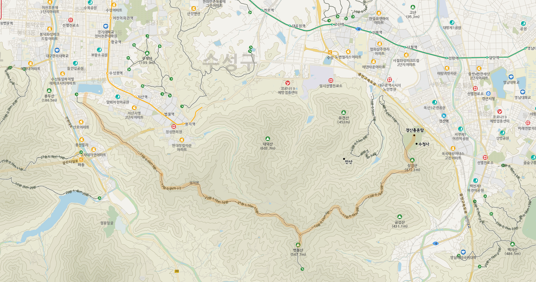 경산역에서 수성못까지 걸었다고 생각하면 되는데 이걸 공비처럼 산길로 걸었네요.
