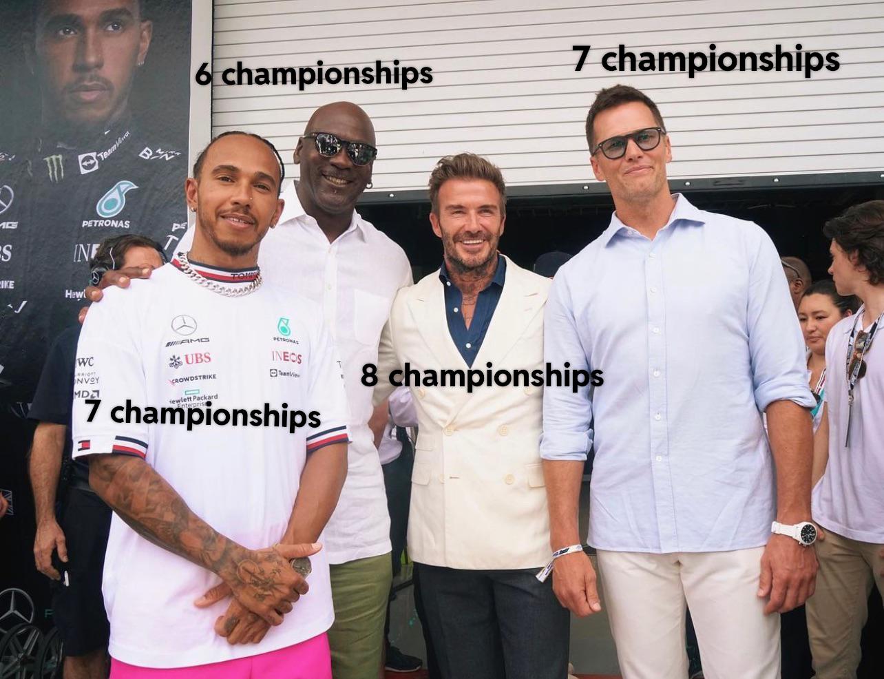 17. 스포츠 최고 스타의 계모임. 루이스 해밀턴(F1), 마이클 조던(NBA), 데이비드 베컴(축구), 톰 브래디(NFL)