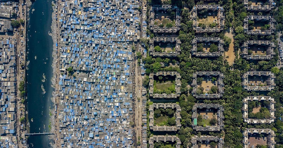 9. Johnny Miller가 촬영한 버드아이. 인도 뭄바이의 극심한 불평등을 포착합니다(왼쪽은 다라비 슬럼가이고 오른쪽은 국립 증권 거래소와 같은 공공기업단지 건물입니다).