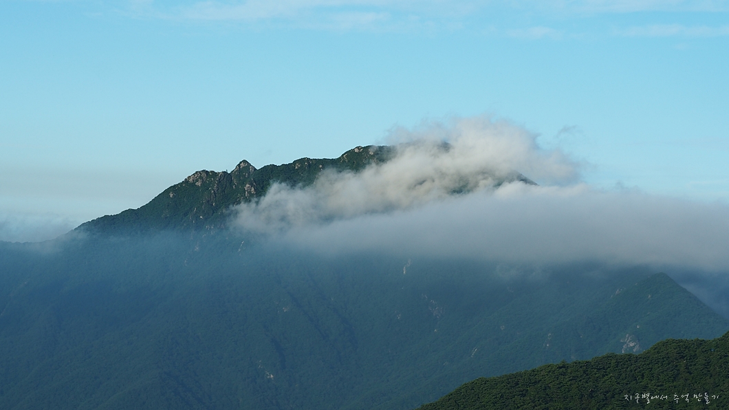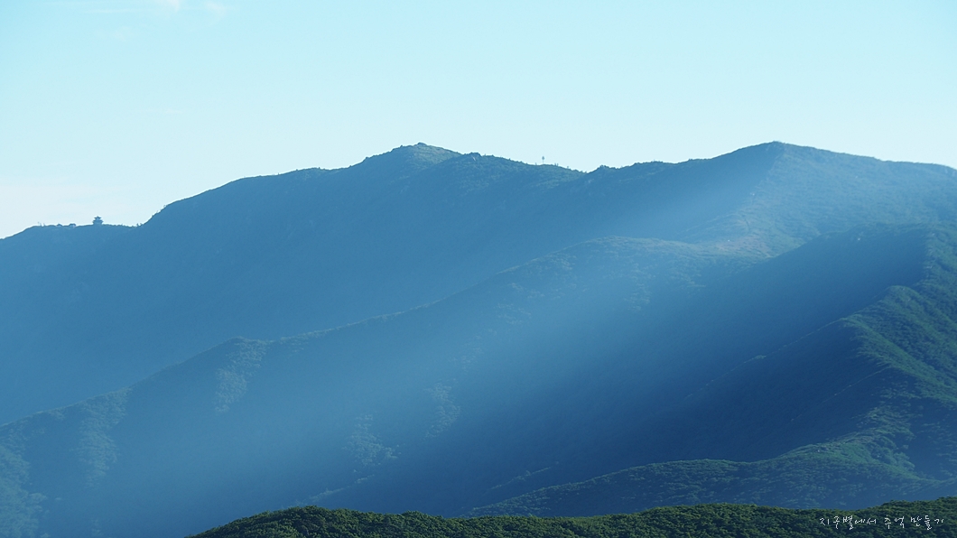 정상인 천왕봉과 조화봉의 강우레이더 관측소 탑이 뚜렷합니다.