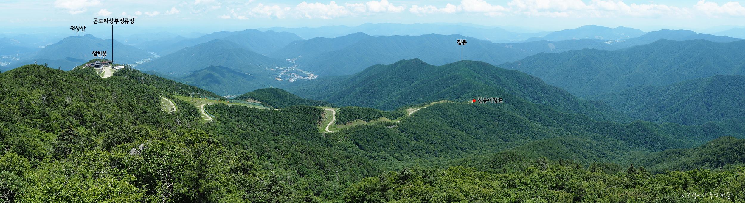 사진에서 보이는 스키 슬로프를 따라 칠봉 이정표라고 표시된 곳까지 내려가서 우측 숲길로 들어가면 됩니다.