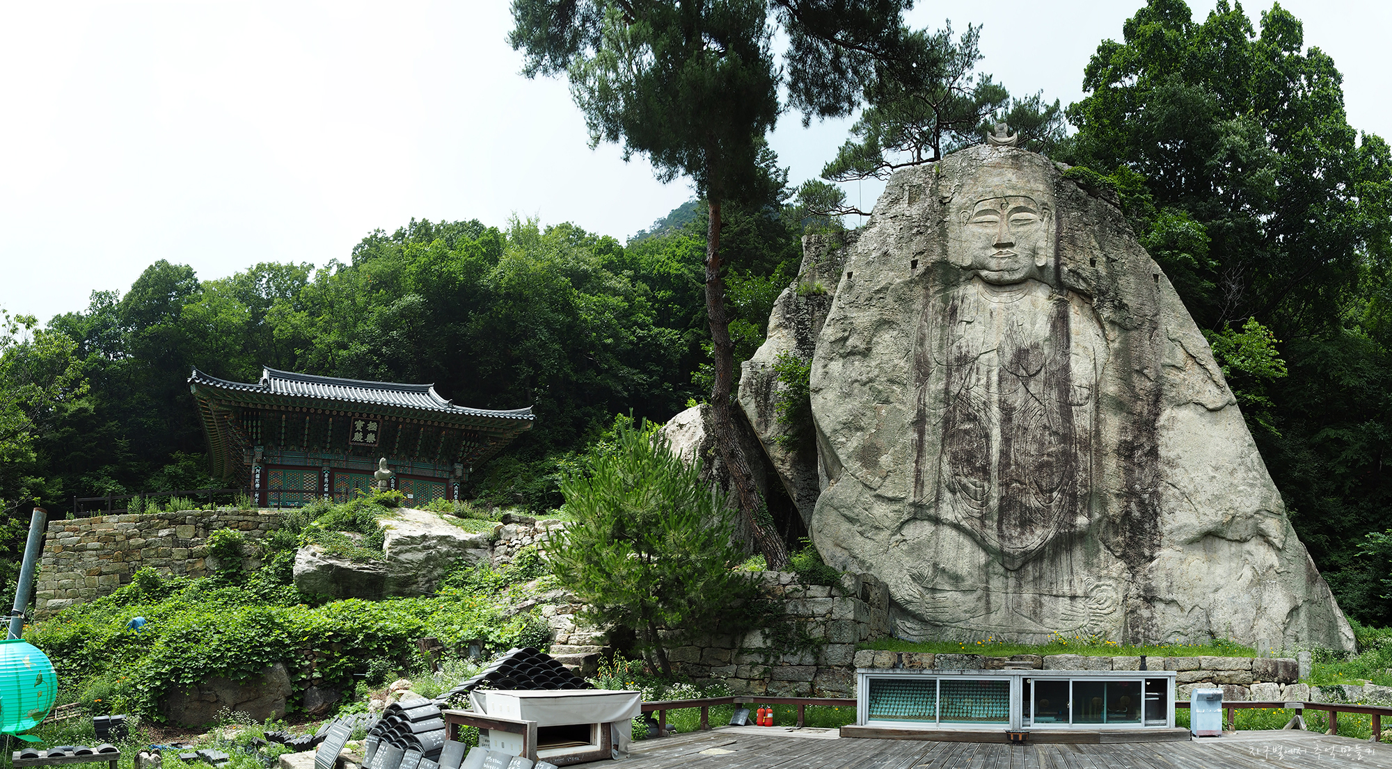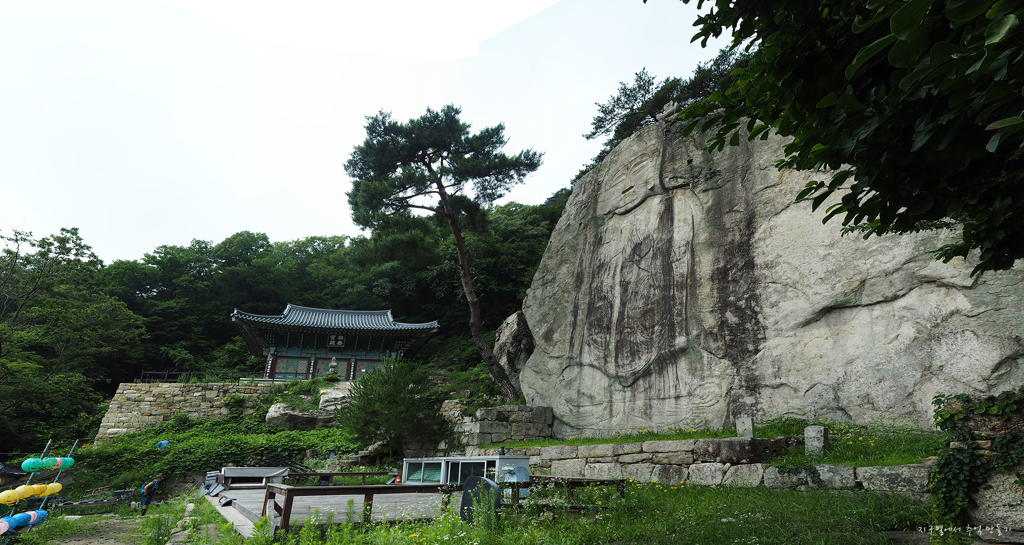 서너채의 전각이 보이고 중앙에 커다란 마애불이 보입니다.