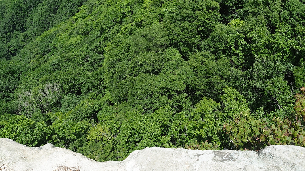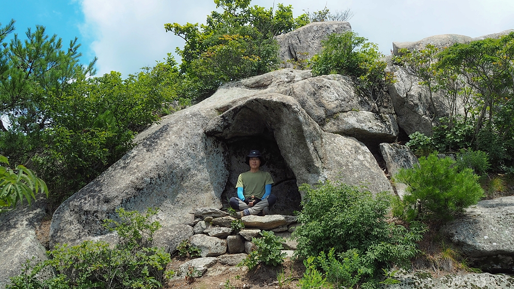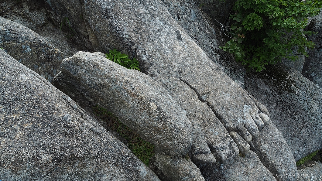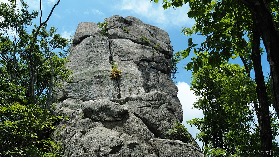 정상에서 바위를 타고 남쪽으로 한칸 내려오면 있습니다.