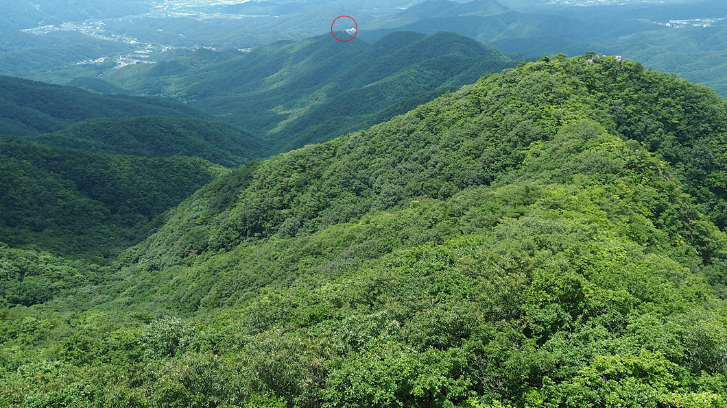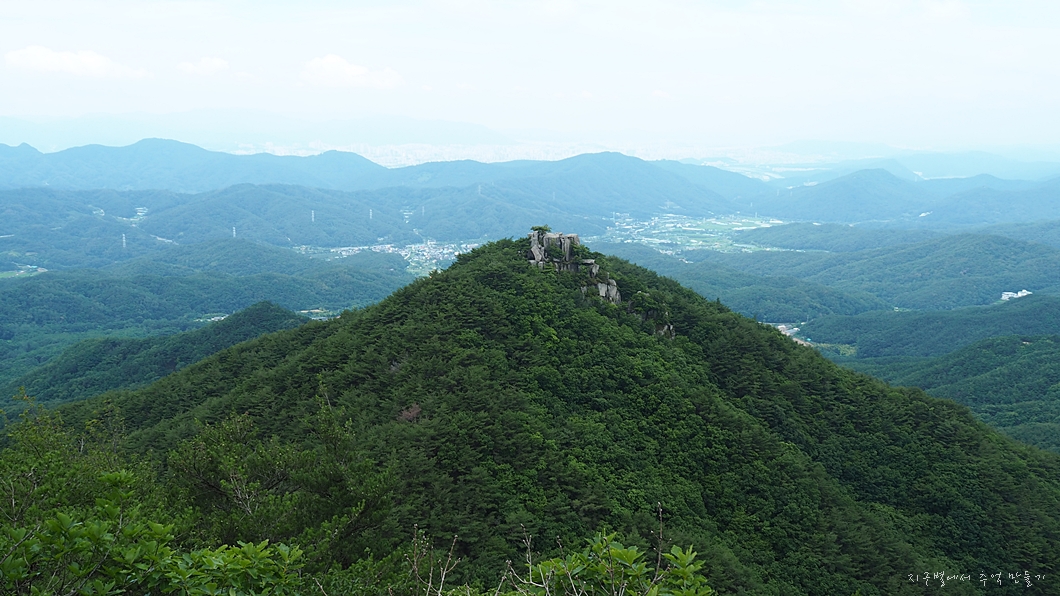 능선 끝 멀리 장군바위가 있고 아래로는 능선 자락 용주암이고 뒷편 환성산입니다.