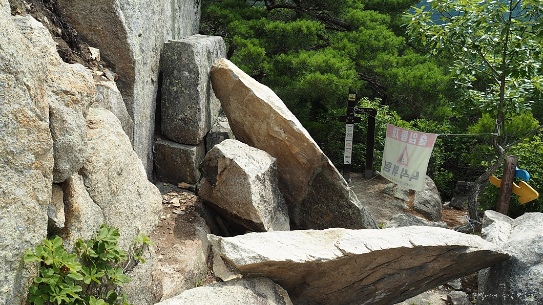 인봉 둘레로 금줄이 쳐져 있는데 앞쪽 바위들이 흘러 내렸네요.