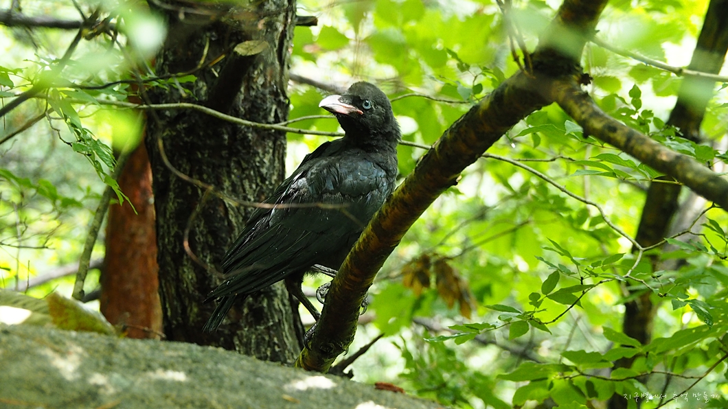 만물상 올라가는 초입 계단에 아기 까마귀가 날지도 못하고 가지에 앉아 있습니다.