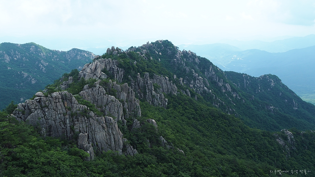 멀리 남산 제일봉이 이빨처럼 보이고 그 뒤 비계산과 우측으로 작은 가야산 능선이 보입니다.