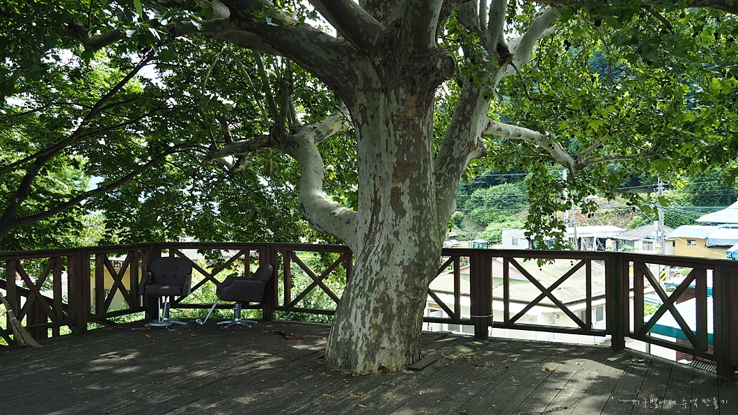 보통 느티나무나 팽나무가 시골 쉼터에 자리하고 있는데 이곳에는 플라타너스가 대신하고 있습니다..