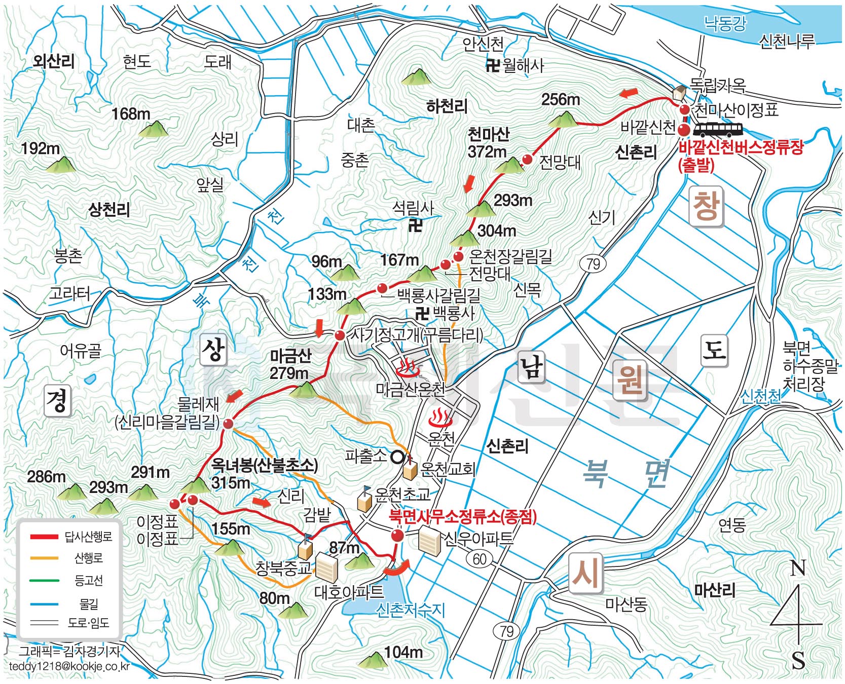 가장 높은 천마산 고도가 372m이지만 곧장 내려 가야하는 사거정고개의 고도는 90m 그리고 다음 급경사로 오르는 마금산은 279m 또다시 내려가서 물레재 170m, 다시 올라 옥녀봉 315m..