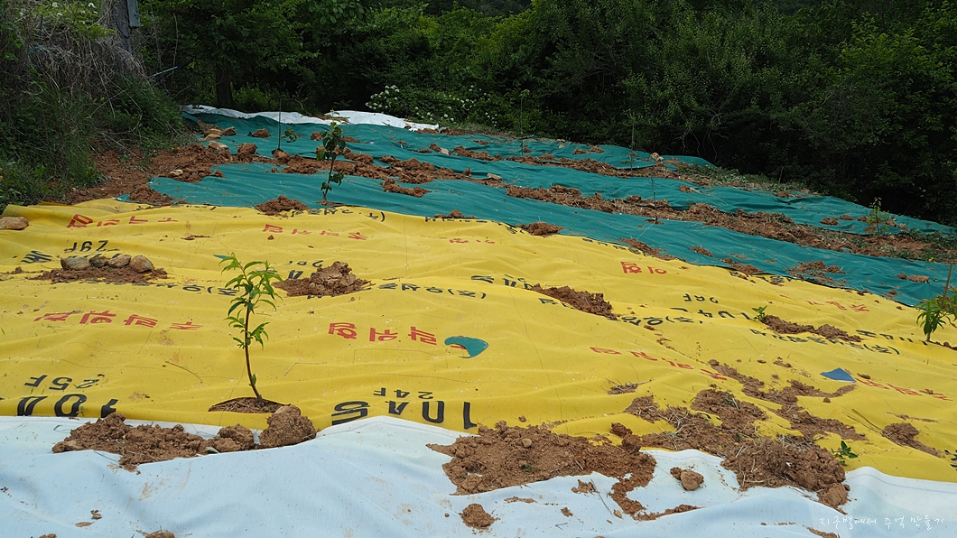 더욱더 기발한 생각은 나무 옆에 돋아나는 잡초를 일거에 방지하기 위하여 그 위에다 건축용 보호망으로 모조리 덮었다.