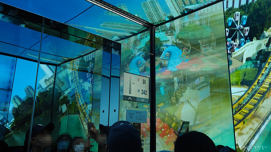 엘리베이터는 버튼 한번 두르면 117층까지 곧장 올라 가는데 양 옆과 위가 디지털화면으로 되어 있어 정신없이 구경 하다보면 어느듯 117층 도착.