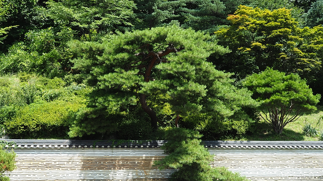 본전 옆 담 뒤에는 예사롭지 않은 소나무가 한그루 내다 보고 있구요.