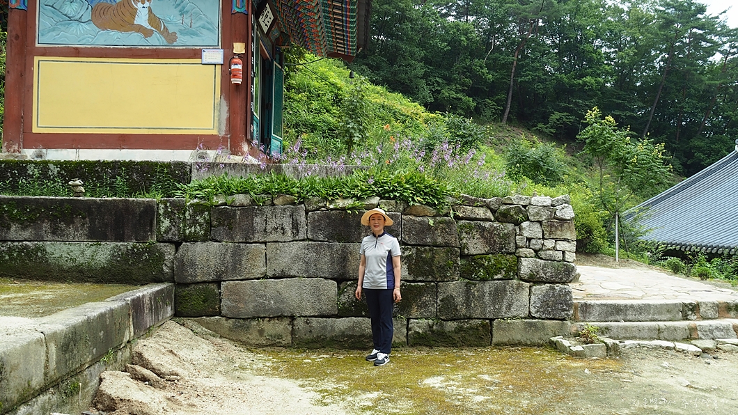 극락보전 옆 삼성각 아래 보랏빛 꽃이 예뻐 찍으려고 하니 김여사가 모델을 자청합니다.