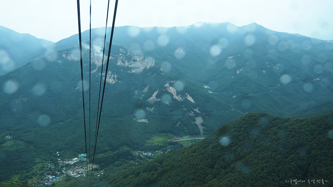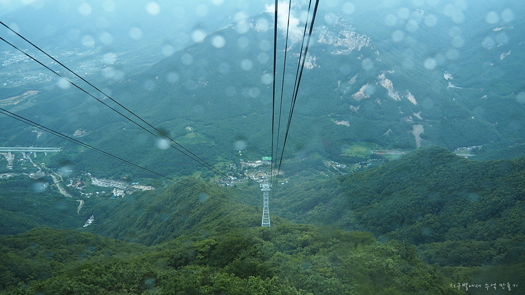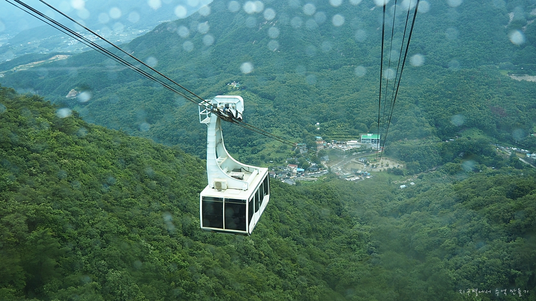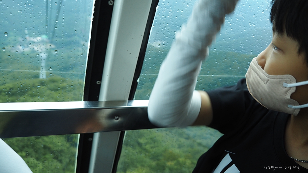 비가 많이 와서 지율이는 걸어 내려가야 되나 걱정했는데 다행히 케이블카 타고 내려가게 되니 안심인가 봅니다.