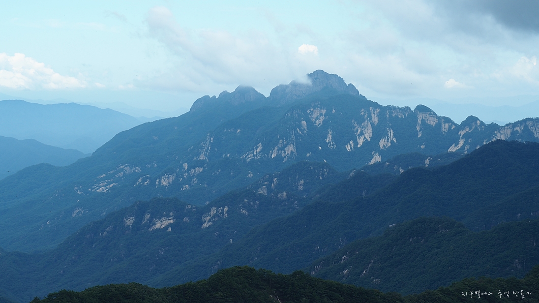 좌측 솟아있는 봉우리가 관봉(고깔봉)이고 우측이 주봉입니다. 영봉은 그 뒤로 보이지 않네요.