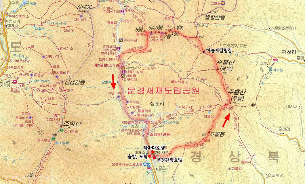 산행 코스 : 문경관광호텔 - 관봉(고깔봉) - 주봉 - 영봉 - 하늘재갈림길 - 부봉(1봉~6봉) - 제2관문 - 제1관문 - 문경관광호텔(원점회귀)