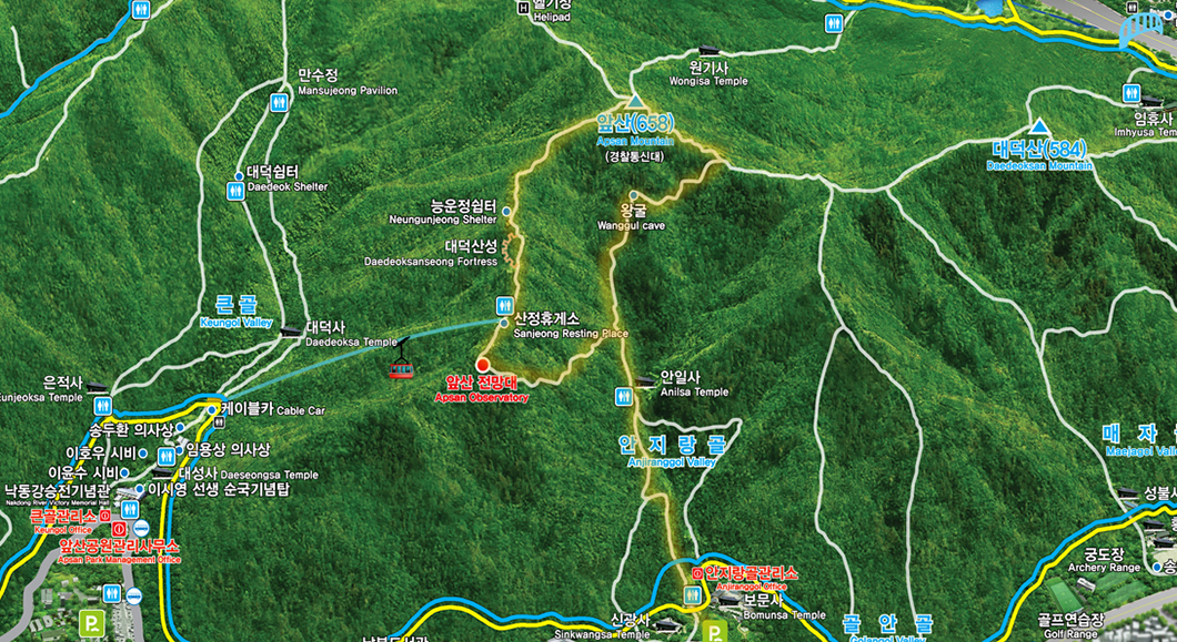 산행 코스 : 안지랑골 입구 주차장 - 안일사 - 돌탑 - 왕굴 - 정상 - 케이블카 휴게소 - 앞산 전망대 - 안일사 - 주차장(원점회귀)