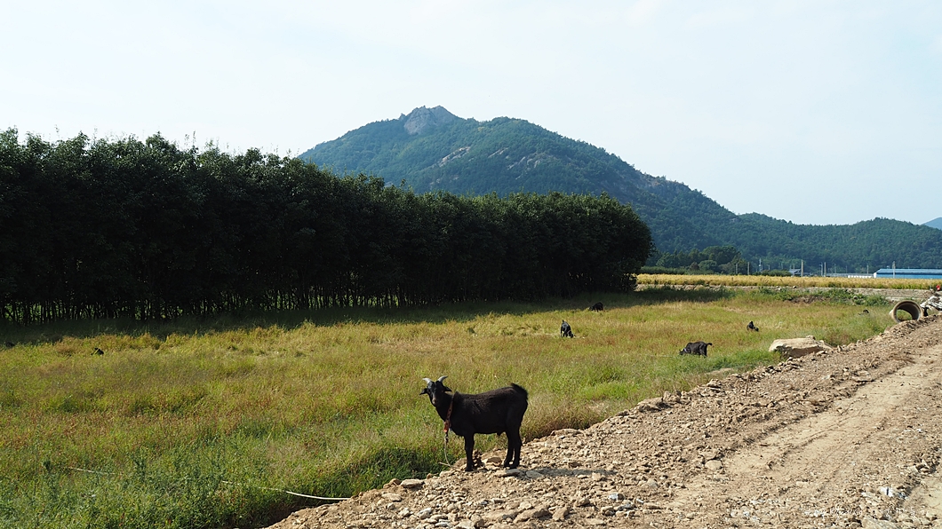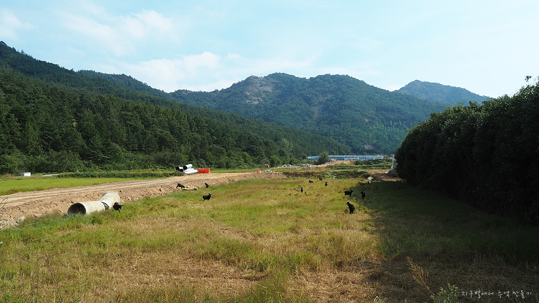 공사중인 들길을 따라 걸어가는데 풀밭으로 된 밭에 염소들이 가득 합니다.