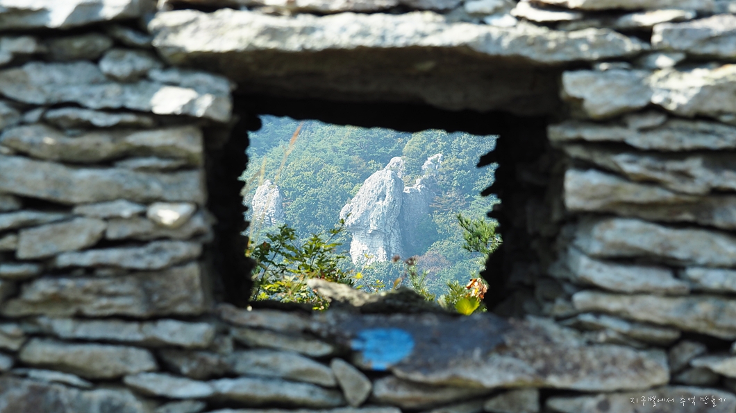 그 중 거시기 형태를 닮은 이 돌탑의 가늠자 구녕을 통해 보면 멀리 더욱 거시기한 바위가 보이는데..