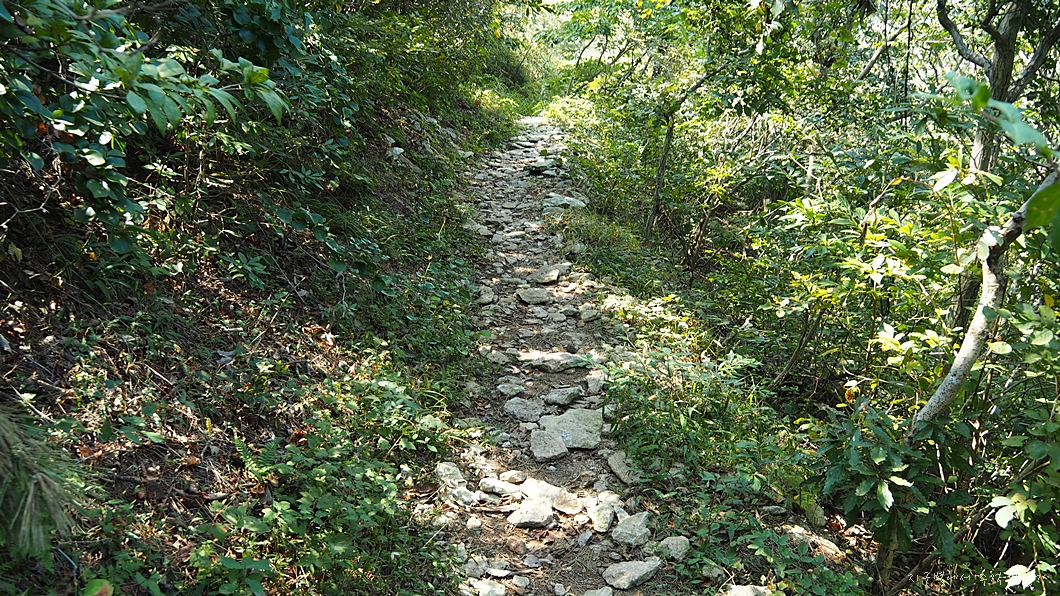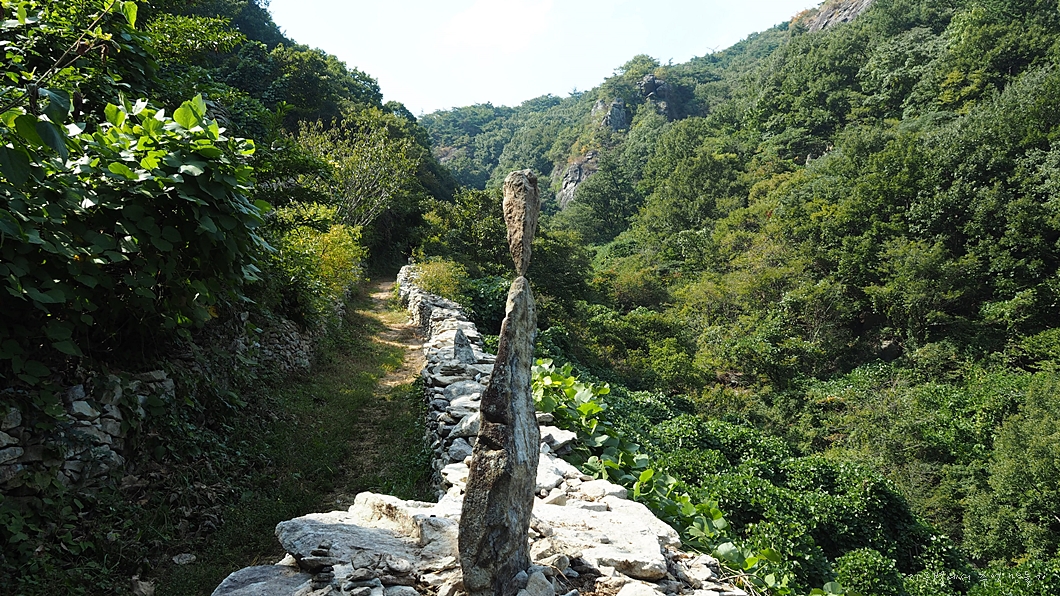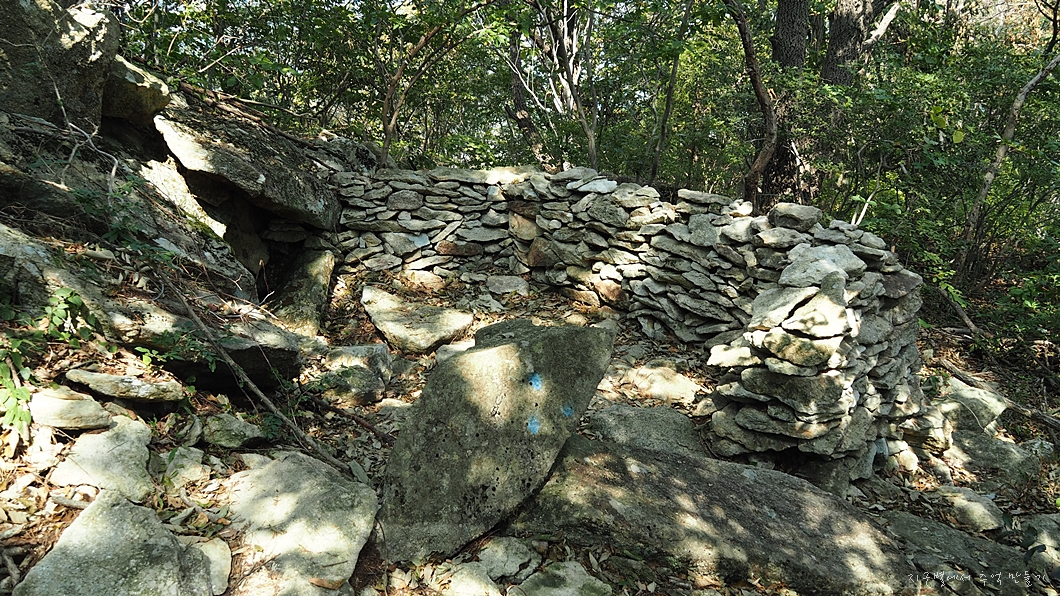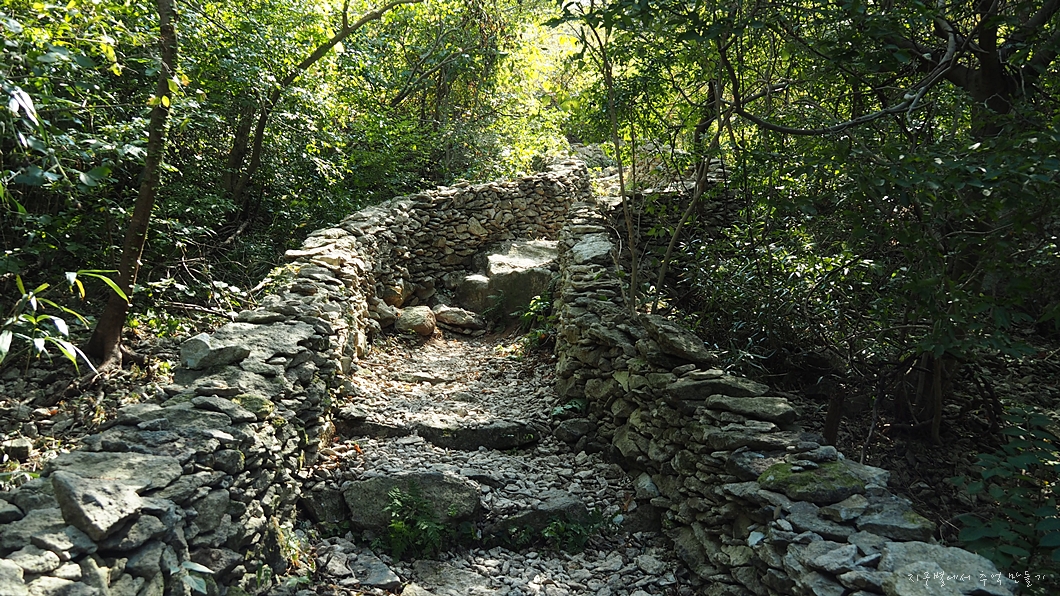이곳에 널려 흔해빠진 구들장 점판석으로 성벽같은 담길을 만들었는데 이 세상에서 가장 멋진 등산로가 아닐까 생각됩니다.