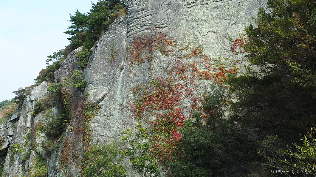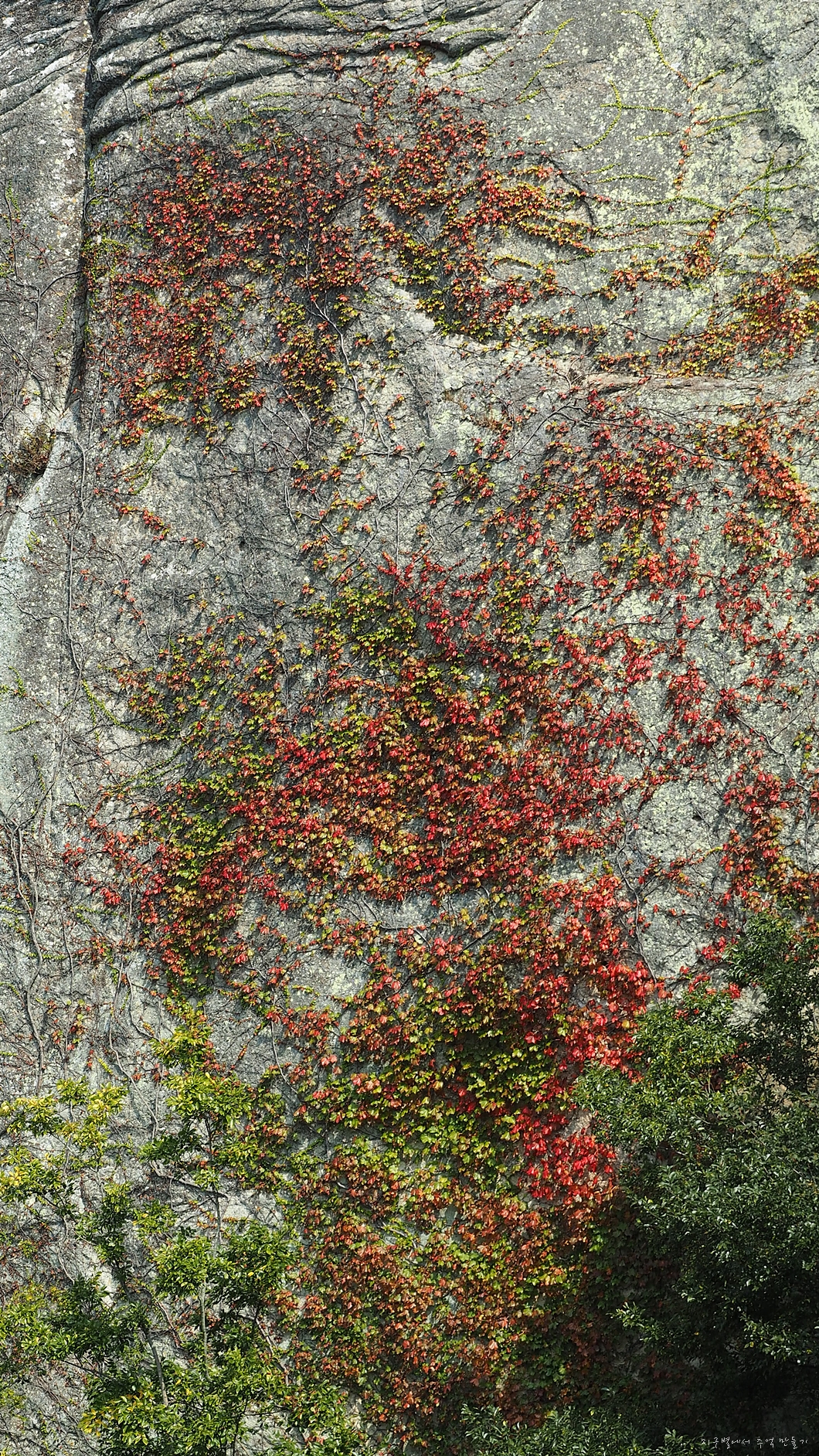 암벽의 담쟁이가 가을 옷으로 갈아 입는 중이네요.