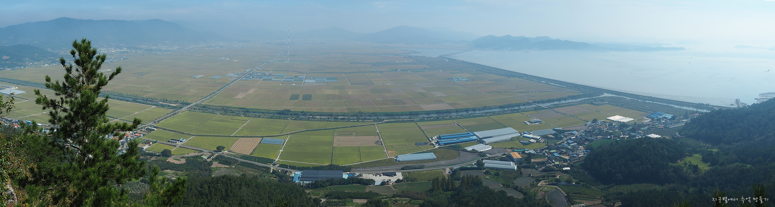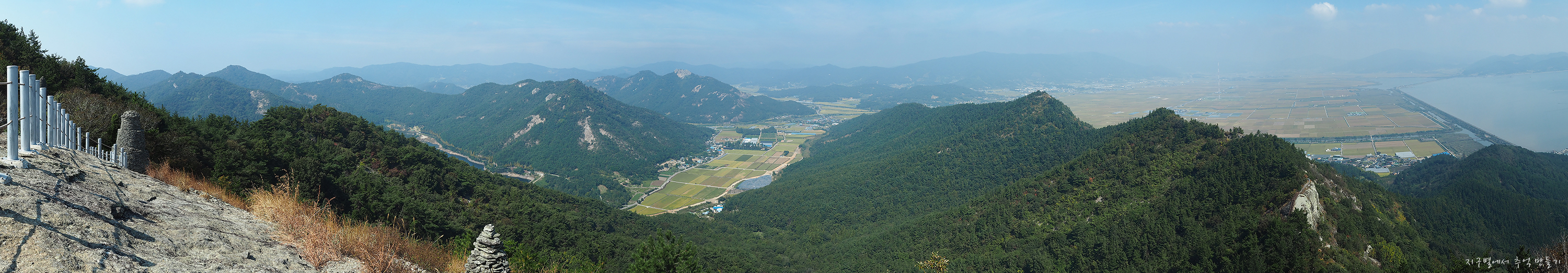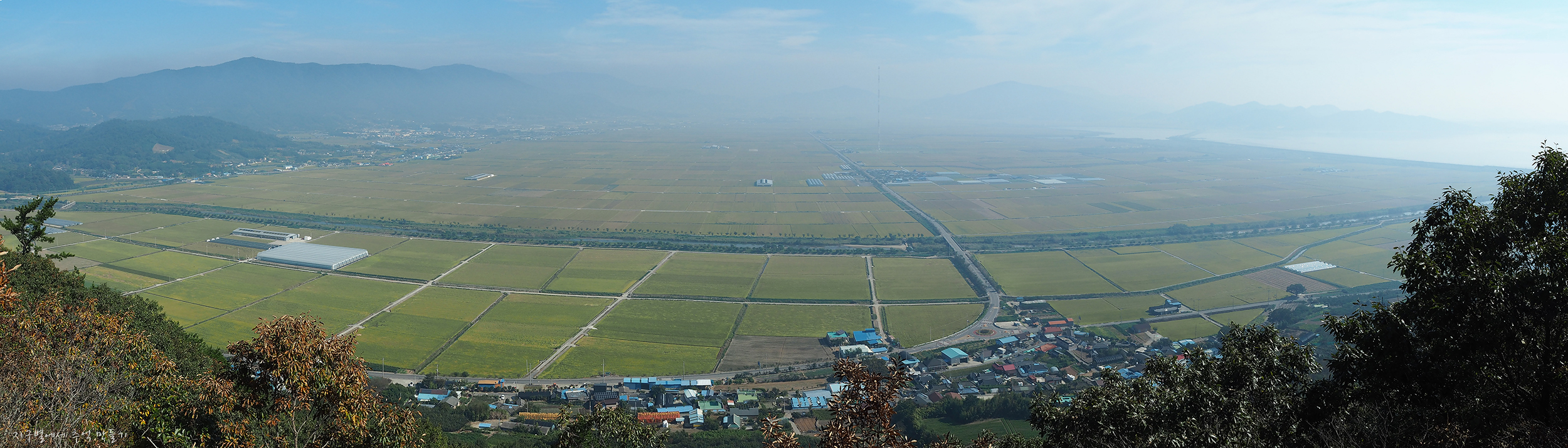 쌍봉 앞으로 계곡 사이에 자리한 황금 논밭 풍경과 우측으로 간척지 들판