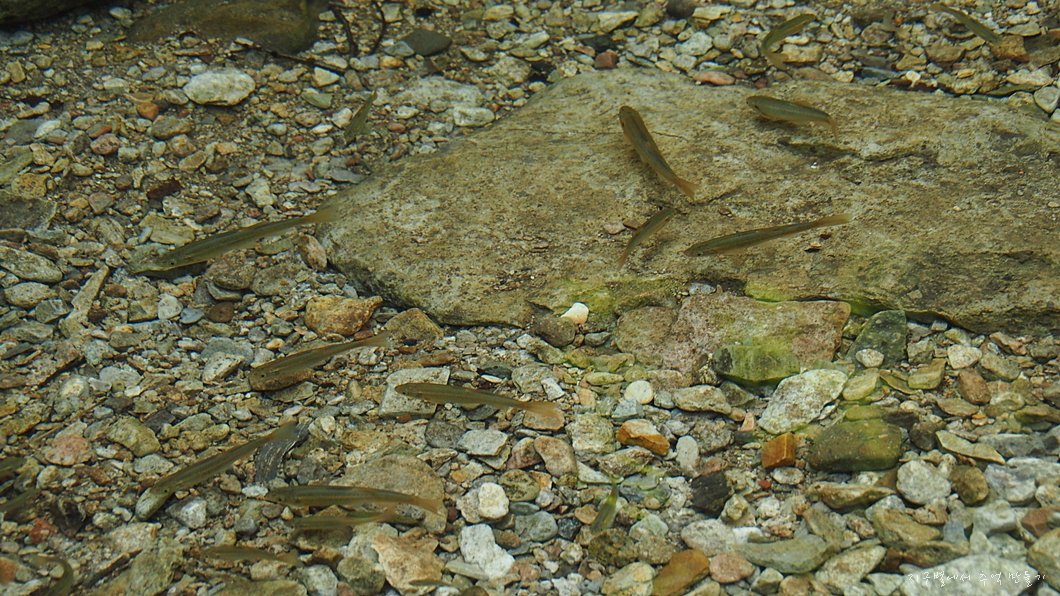 깨끗한 폭포수 아래에는 손가락 굵기만한 피래미들이 지들끼리 잘 놀고 있네요.