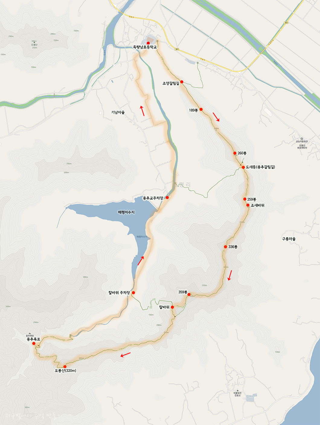 지도 캡쳐하여 만든 제가 다녀 온 오봉산 등산 지도입니다.