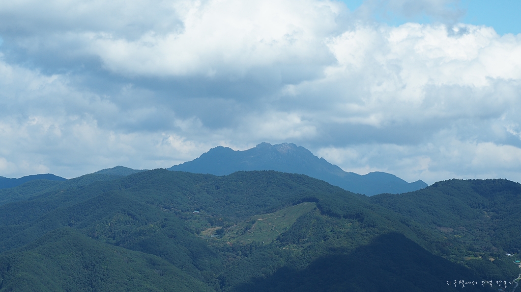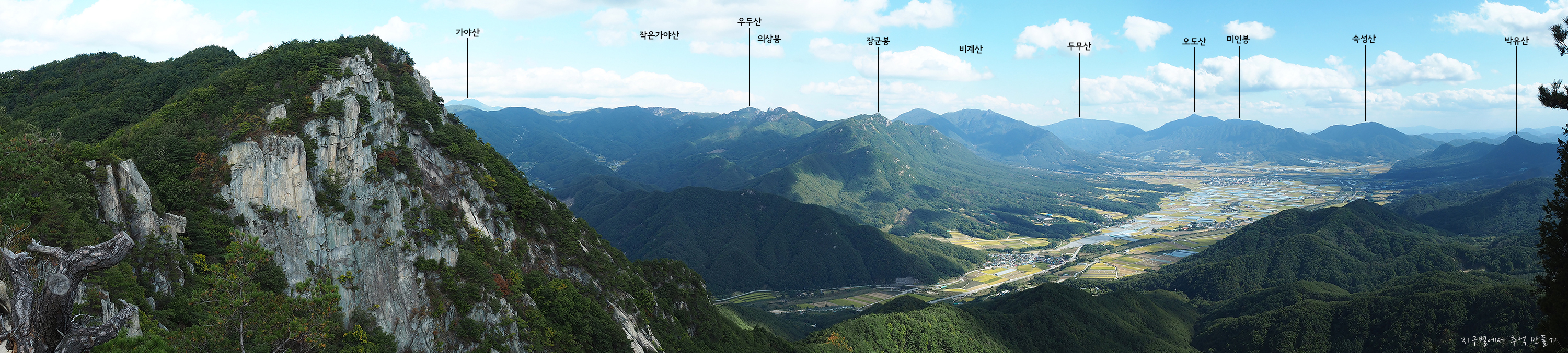 좌측으로 가야산이 머리를 내밀고 있고 중앙으로 우두산 능선. 그 뒤로 비계산이 솟아 보입니다.