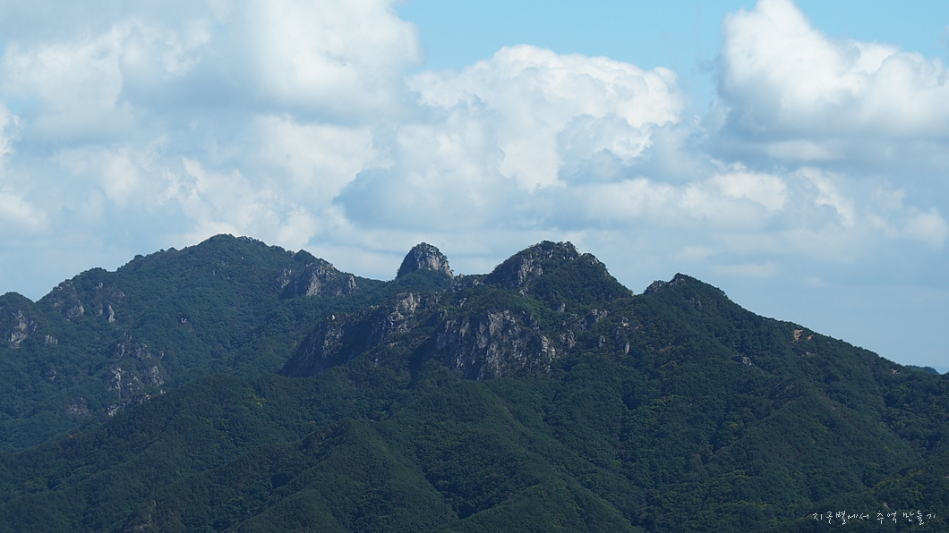 좌측 작은 가야산, 중앙은 우두산의 의상봉과 장군봉 능선. 좌측은 비계산.