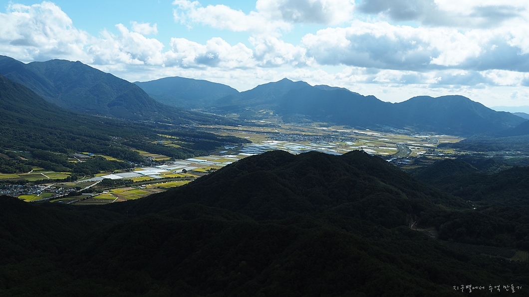 비계산, 두무산, 오도산, 미녀봉, 숙성산이 차례로 둘러쳐진 가조평야가 내려다 보입니다.